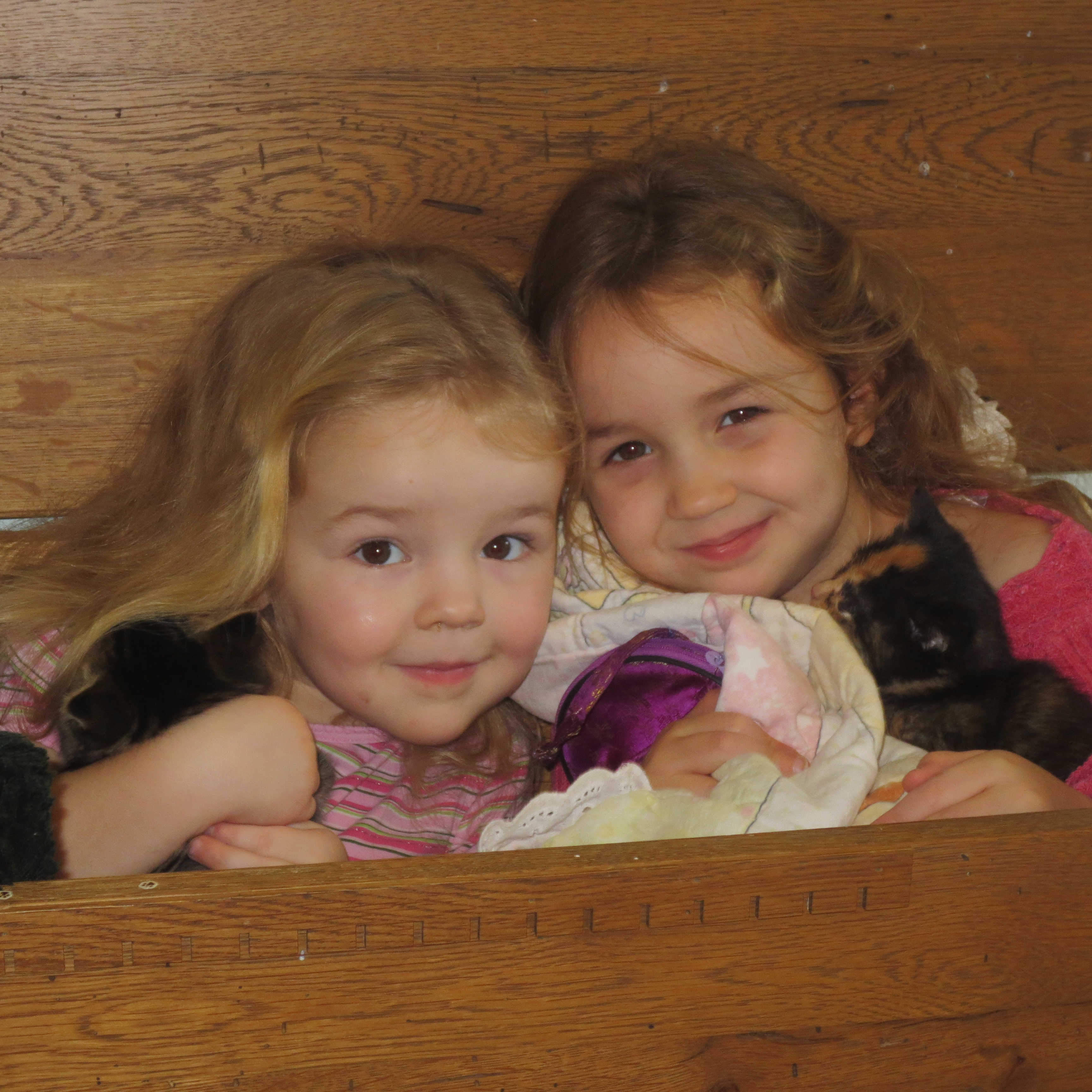 El, for a while I thought the empty toy box is too radical. Like, surely they will get too bored and I will cave and bring back the toys to brim full. This is two months now, and I am sold. Yesterday we stowed the dolly and its bag of clothes. Olivia actually cheerfully took it to the attic herself, “for later”. They play so sweetly (mostly) with the hand full of stuffed animals that are currently in the toy box. And with old curtains and gloves and dress ups and measuring cups and coloring books… Of course, they have each other and their kitties. What more could one want?