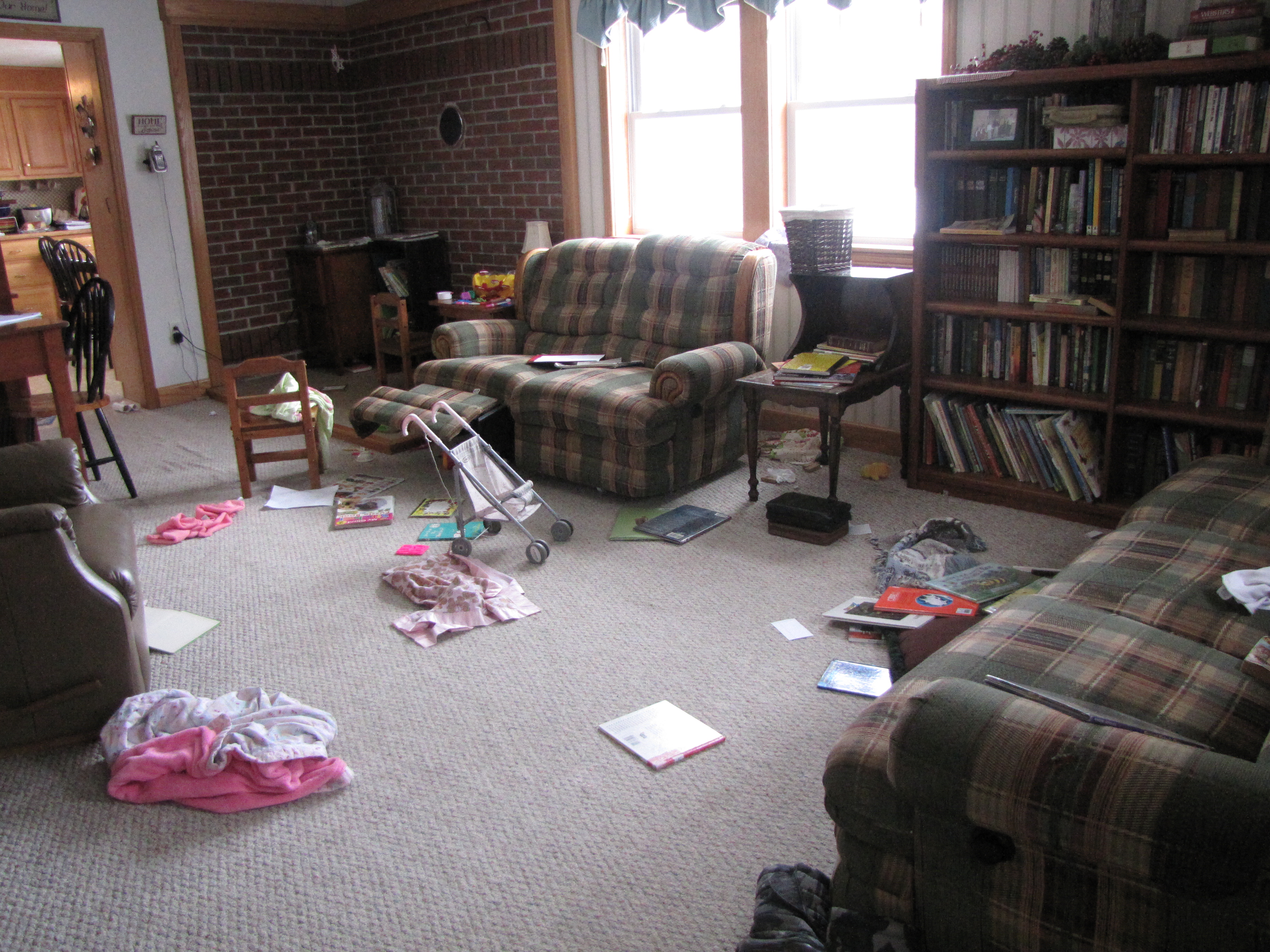 This photo was taken yesterday. We clean up every day, I tell you, but this seems to recur on a 25-bits-of-rubble per hour basis. Today, I cannot sit and gaze with longing at what I do not have. Today, I will gird up my loins and clean out the junk behind the couch. I will be grateful that we have real people living in this house. I will praise God that I get to serve these people and I get to teach them how to keep chaos at bay with the daily rituals of order and cleanliness that we strive to attain. Today I will keep things in perspective, because only an “accident of birth” keeps me from living in this: