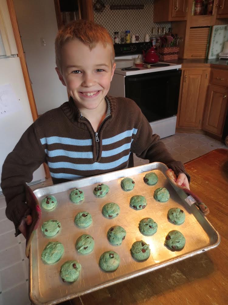 I have mentioned Gregory’s happy place in the kitchen, how he hums and dusts flour and dispenses chocolate chips with benevolence. Recently he has discovered food coloring. It takes me right back to my childhood days when my brothers and cousins put coloring in things like potatoes or eggs. Did I unwittingly pass on this gene as a Schlabach thing, or is it inherent in every small boy? At any rate, we have red and green and blue and orange chocolate chip cookies in the house just now. “They look fantastic!” he said as he pulled them out of the oven. Behold the blue batch.