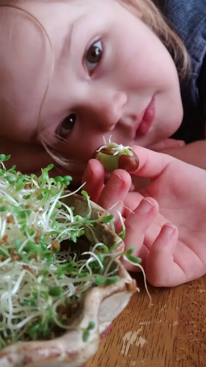Olivia had a science experiment in this period of time, where she was supposed to check the germination of bean seeds. We found some dried kidney beans, put them in a moist environment, and then nearly gave up on them. It was about a week before there was even a noticeable crack in the beans’ seed coats. We peeled one open and saw the embryo starting to put out a shoot inside. So we kept them moist instead of throwing them out. Today we are eating the second round of sprouts since the kidney beans venture started, and they look just like the photo shows, greeny cotyledon and lots of rootlets coming out of the shoot. Olivia is so tickled that the experiment worked after all.
