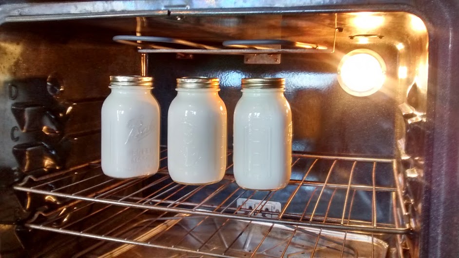 I pour the mixture into quart jars, screw on lids, and set them into the oven with the light on overnight. (Shut the oven door, of course. This keeps the oven at a nice cozy temperature, just right for fermentation.) Usually after 12 hours the yogurt has thickened nicely. Plain yogurt, easy, peasy.