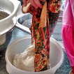 The last step is whisking the drained yogurt until it is smooth and happy. It only takes a minute, but makes your end product look really much like the Fage or Oikos that you buy at the grocery store. This gives me 2 quarts of yogurt from a gallon of milk at 2 dollars a gallon. Those little 6 ounce pots cost a dollar on sale. You do the math. 🙂