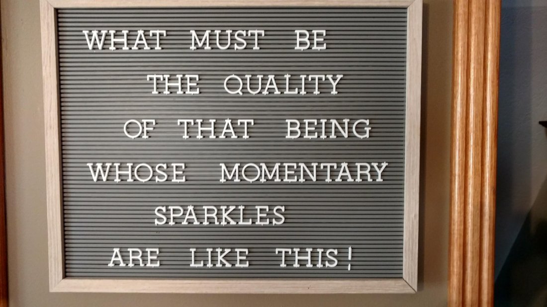We had some fuzzy snow flurries a few days ago, enough to make snow pants and ALL the other paraphernalia a necessity. For a few hours it transformed the muddy brown of November into something other-worldly. Addy grabbed one of my jackets, slipped into her rain boots and ran outside to dance through the swirling snow, the extra long sleeves flapping expressively as she twirled with the dog running circles around her. It reminded me of a quote by C. S. Lewis, “What must be the quality of that Being whose far-off and momentary sparkles are like this?” I put it up on my letter-board as a reminder to focus on the sparkles this winter instead of the icky. The children read it and said, “Huh?” But they don’t need so many reminders to notice sparkly things. (I was one “f” short of being able to use the entire quote. It is an annoyance that’s common to letterboards. )