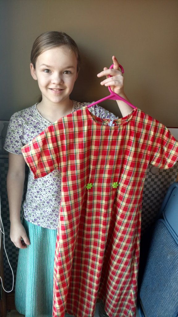 Today Rita sewed her first play-all-day dress. She zipped up the long seams with little regard for the finer details, then I did all the finishing touches and she found green buttons to embellish the front. Her sisters tell her she looks like a picnic tablecloth and she doesn’t even care. I have to say, she moves in a cheerful little cloud of promise of summer when she wears this dress. If I were an ant, I’d crawl right up and feel at home.