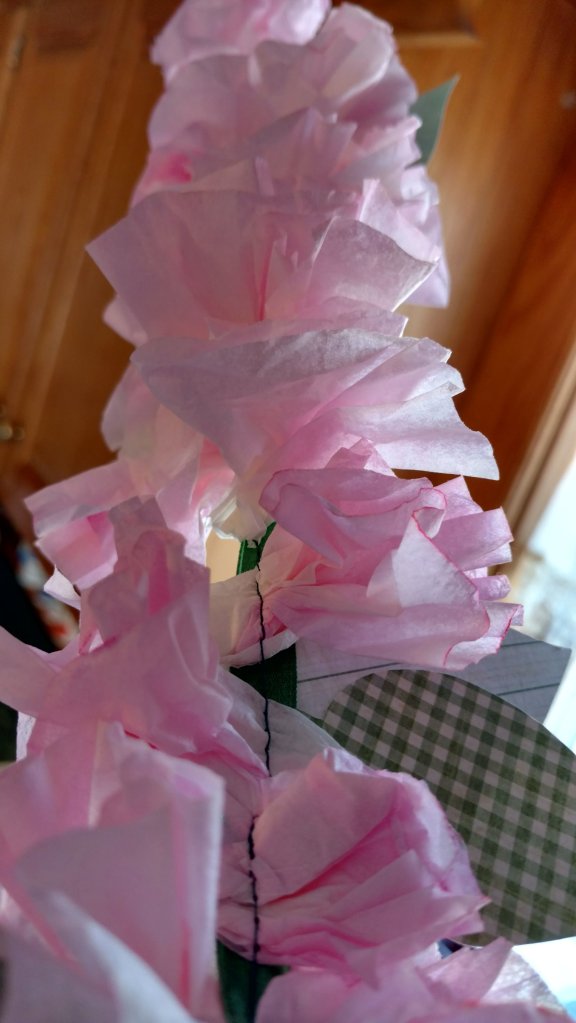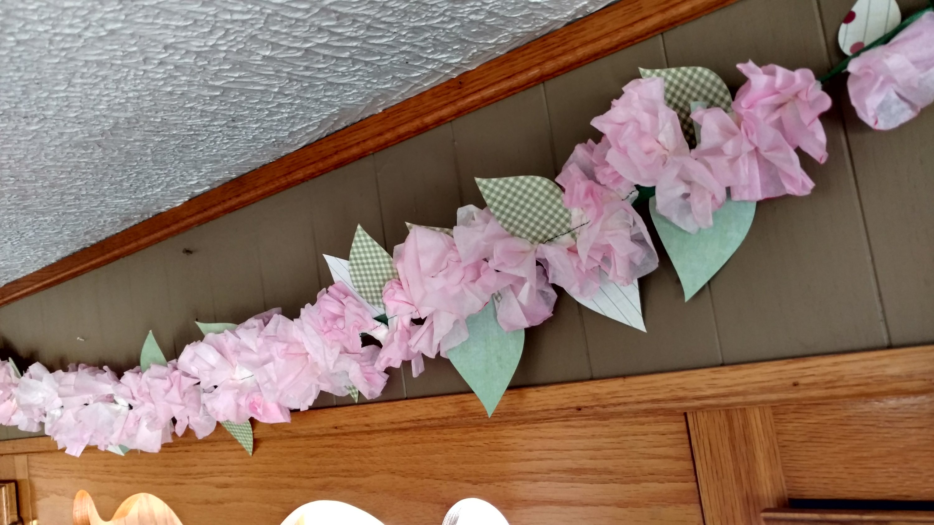 I showed the girls some projects on Pinterest and they took off with coffee filters that we dyed pink in food coloring, then twisted into florals.