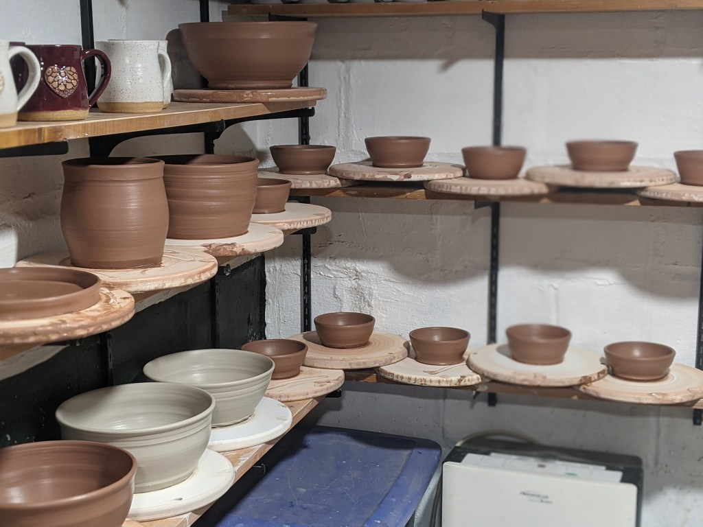 We are a tiny bit ahead on the domestic scene. Addy and I did all the laundry today, even folded and put it away. We are ahead by a number of felt animals that the girls are cranking out as fast as their clever little stitching hands can make them. Gregory is getting ahead by ripping out the tile in the upstairs bathroom, and if you know about demolition therapy, you know that this is a good thing for a young man with excess energy. I got ahead by twenty-five pounds of clay thrown into forms that are not mugs, which is a special therapy for me.