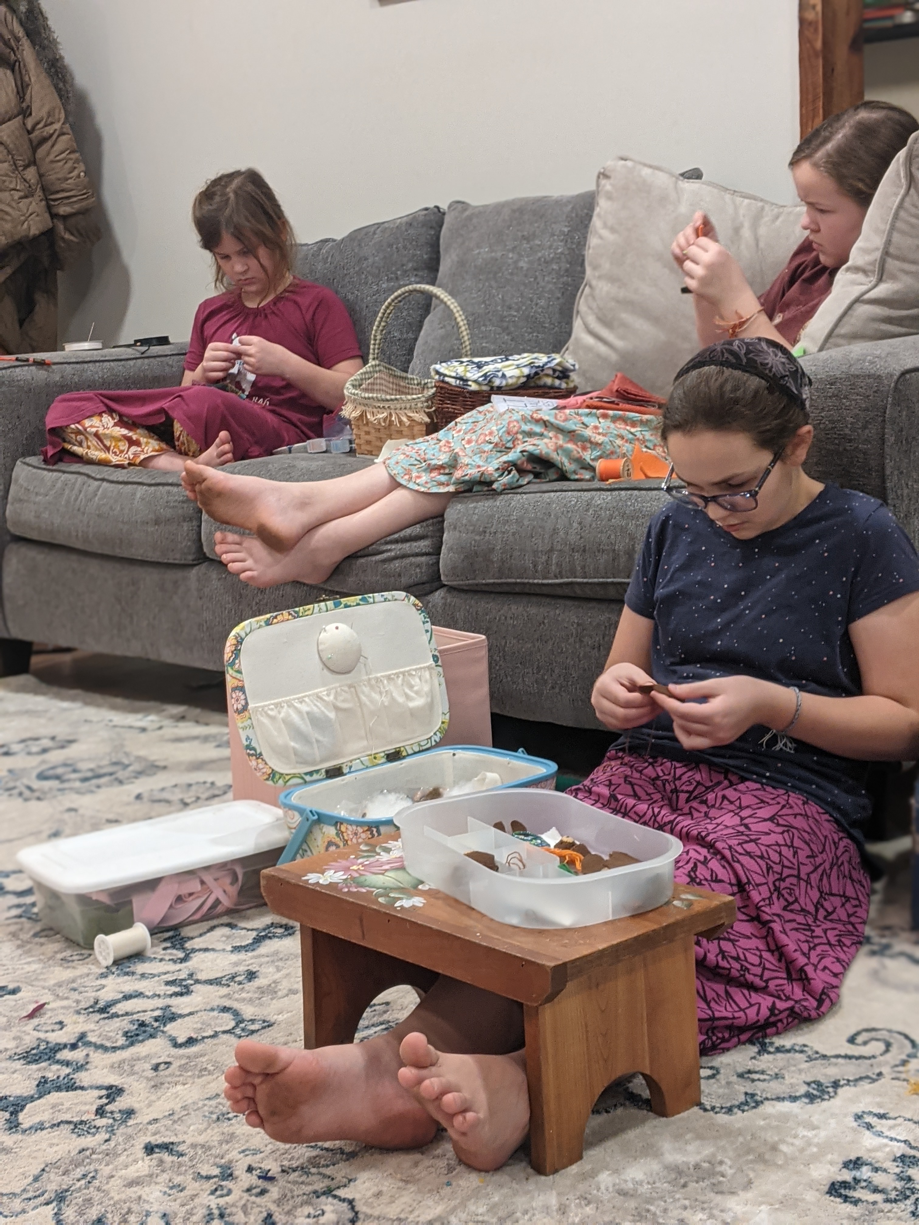 Taking a quick squint around the living space at the end of this day, I see plenty of evidence that we have been selectively industrious. There are a lot of projects littered about the living room where the girls listen to Audible stories while they craft. This includes embroidery, beading, knitting, and some fabric scraps that appear to be hanging out just in case they are needed. There are stacks of storybooks, as well, and some fifty states worksheets that Addy is working on with colored pencils. We have numerous school books strewn about, because we have not finished out our week of lessons and will conclude them tomorrow.
