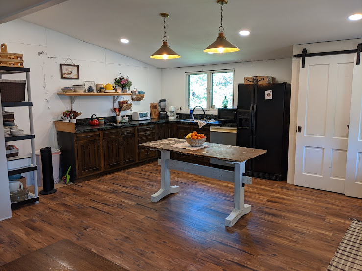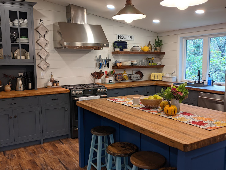 We got some of our new appliances in March, 2021. It was wonderful to have tools that worked. I would open the refrigerator doors and gaze at all the space. That, and the huge pantry: game changers! We started having friends over, and one of the ladies wondered if I like the countertop, an old chippy-paint door laid on the former island. I assured her that it was temporary.