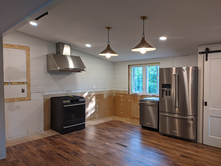 This was August 1, 2020, moving day. I can hardly believe it myself. But the lights worked, and that was cheering. We kept the originals, just moved them to where our future island would be situated.