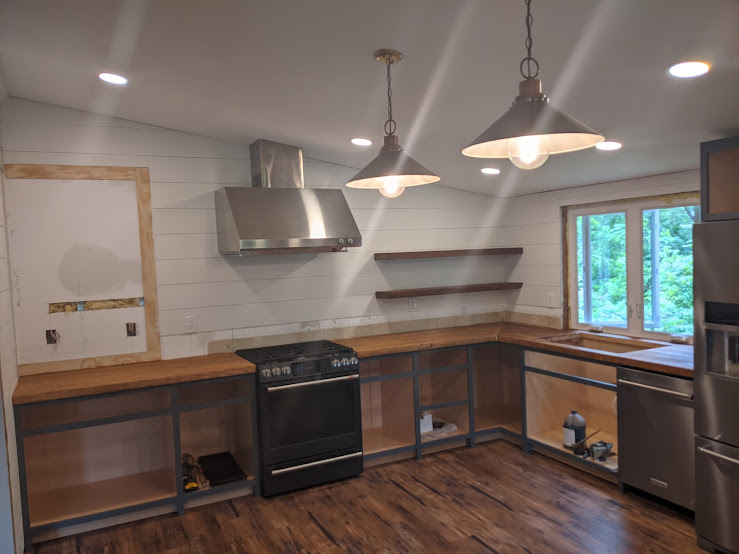 Our cabinet maker installed the boxes so that Gabe could put in the countertops. We had bought sections of bowling lanes on Facebook marketplace. The bowling alley dated to the 1920’s but the lanes had been resurfaced with some extremely hard product. It took us days to sand and smooth them down to butcher block.