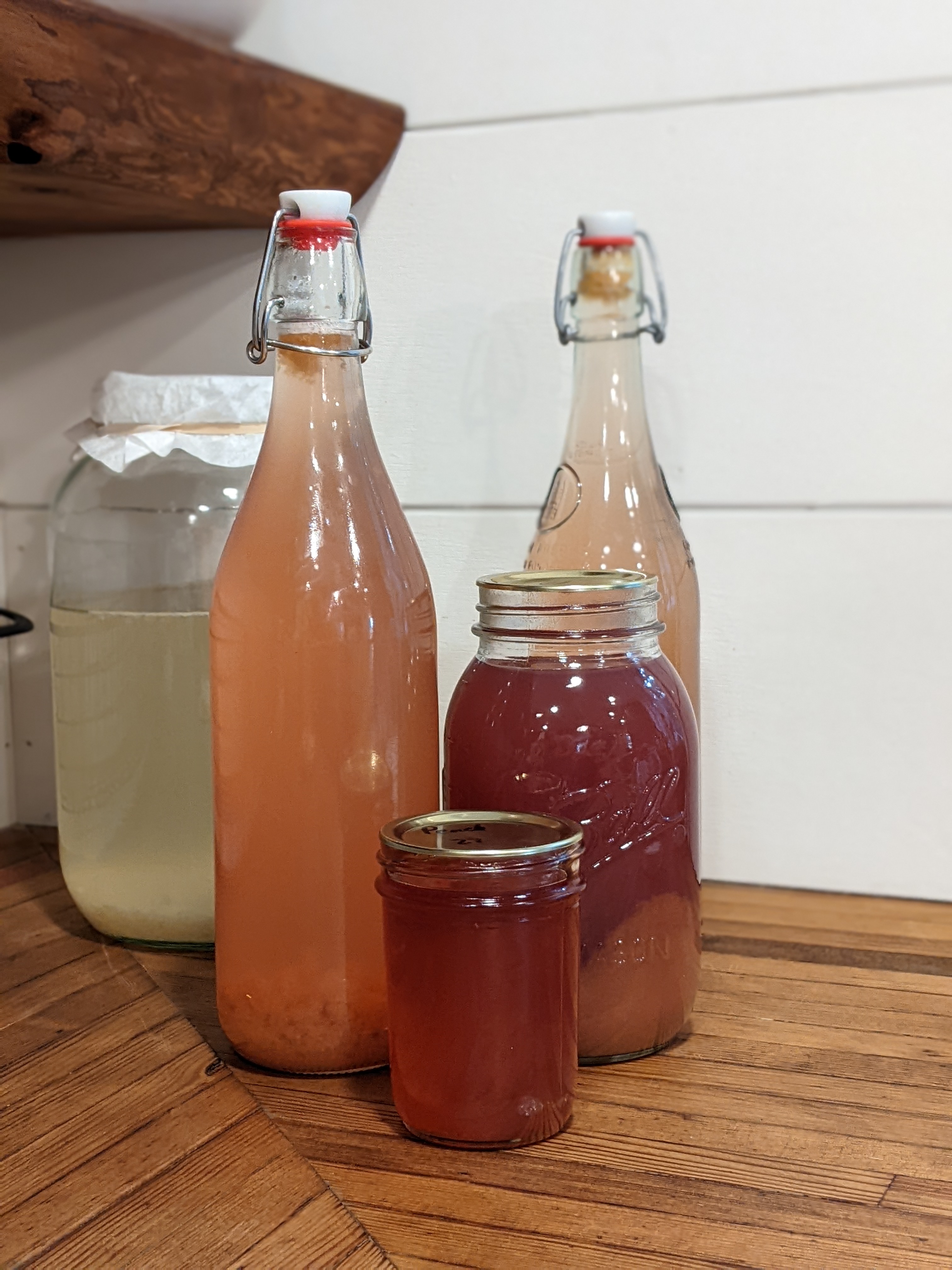 Water kefir making lots of baby probiotics in the back, and then the transformed pinkness in the bottles, getting fizzy. The quart jar is straight peach juice and the tiny jar is poshing shawleh chelly. Should I put on my crunchy mom hat now?
