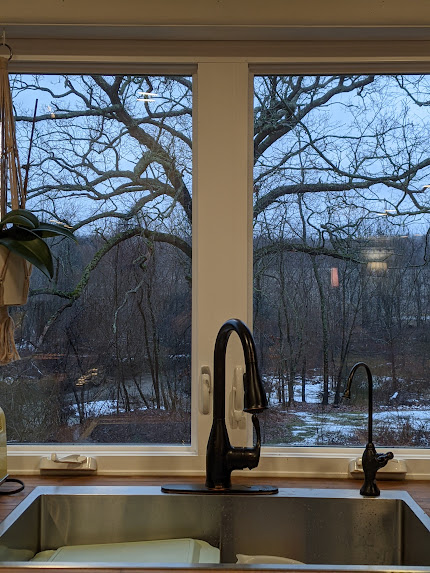 These are the days I pep talk myself into pulling on boots and whatever else is necessary to get outside, clear the cobwebby spaces in my brain. I stroll down to the creek, look at it roaring along brim-full. I look up through the skeletons of trees, admiring their bones. The sycamores with their straight branches and twigs all reaching upward. The graceful droop of the willows. The squiggly twigs of the walnuts and cherries and apples. The enormous limbs of the ancient oaks in our backyard. Learning to identify naked wintertime trees makes them less sad to me; they are elegant and brave, individual fingerprints against the sky. I watch the red-tailed hawk hunting over the field, shrieking as it rides thermal winds. The clouds have just enough definition for me to see that they are tearing along with occasionally a shred of blue space.