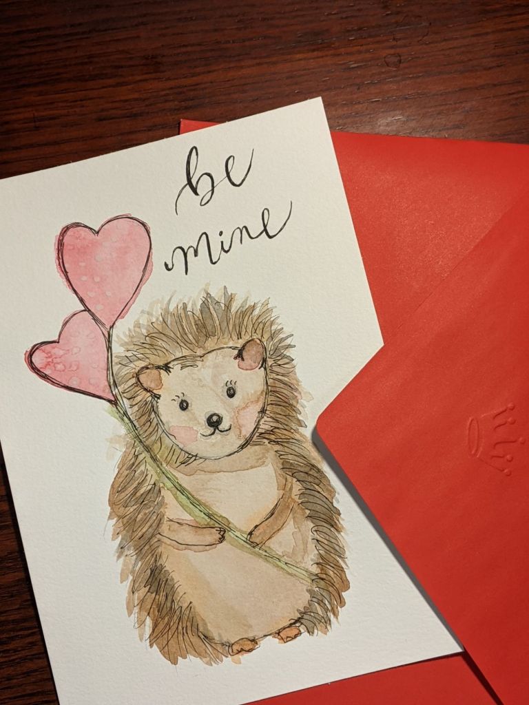 Back to Valentine’s Day and cards: I found myself trying to watercolor a prickly little hedgehog, holding two heart balloons. As we say at our house when a project turns out slightly less than we hoped it would be, “An attempt was made.” Once it was dried, I flipped it over, and that’s where I could really let loose. Words!