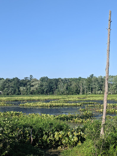 the sludgy green swamp at the edge of the trail, where waterbirds stand statuesque, waiting for dinner to swim by.