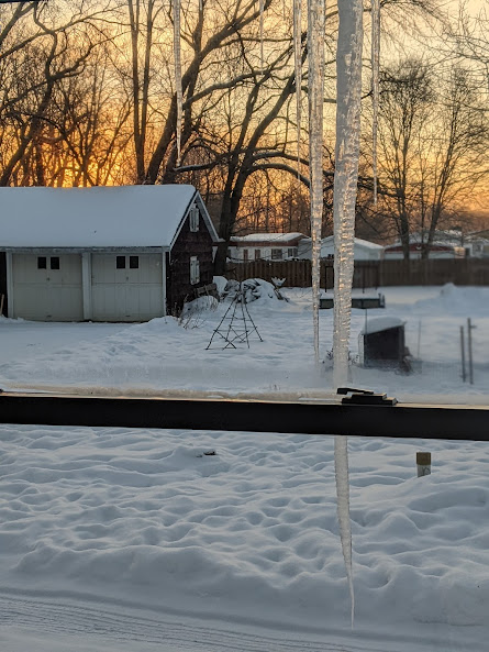 We had a sunny day last week that melted the stuff on the roof, so that we had enormous icicles growing outside the windows. Rita called the most impressive one Big Jimmy and everybody got invested in watching how much he would grow. Two of the girls even dreamed that various neighbors came and broke off Big Jimmy before he reached full potential. Methinks we need broader horizons.