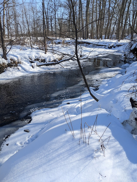Gabe got a mighty itch to buy a snowmobile since we got such a handsome amount of snow. First there were fourteen inches and then a few days later there were ten more inches on top of that. Very little of it melted, so it is quite brilliant outside. He actually did get his hands on an aging snowmobile, apparently one built to go get the groceries in the Arctic, with heated handlebars and all. It is enormous and may reach speeds of 65 mph, requiring a field to make a turn successfully. Yeah, it was quite the thrill, until it died without explanation as he finished the last ride on Sunday night. Now we get to figure out what makes it tick, and maybe the snow will last for a few more months so that we can use it lots more. I believe this could happen. I do heartily endorse finding ways to enjoy it. I break trail down to the creek and walk the trail a few times every day if I can. I remember a Lewis quote: “What must be the quality of that Being whose far-off and momentary sparkles are like this!” (edit: I just looked it up. Lewis said “coruscations” instead of “sparkles”. I think in this case, Lewis overdid it.)