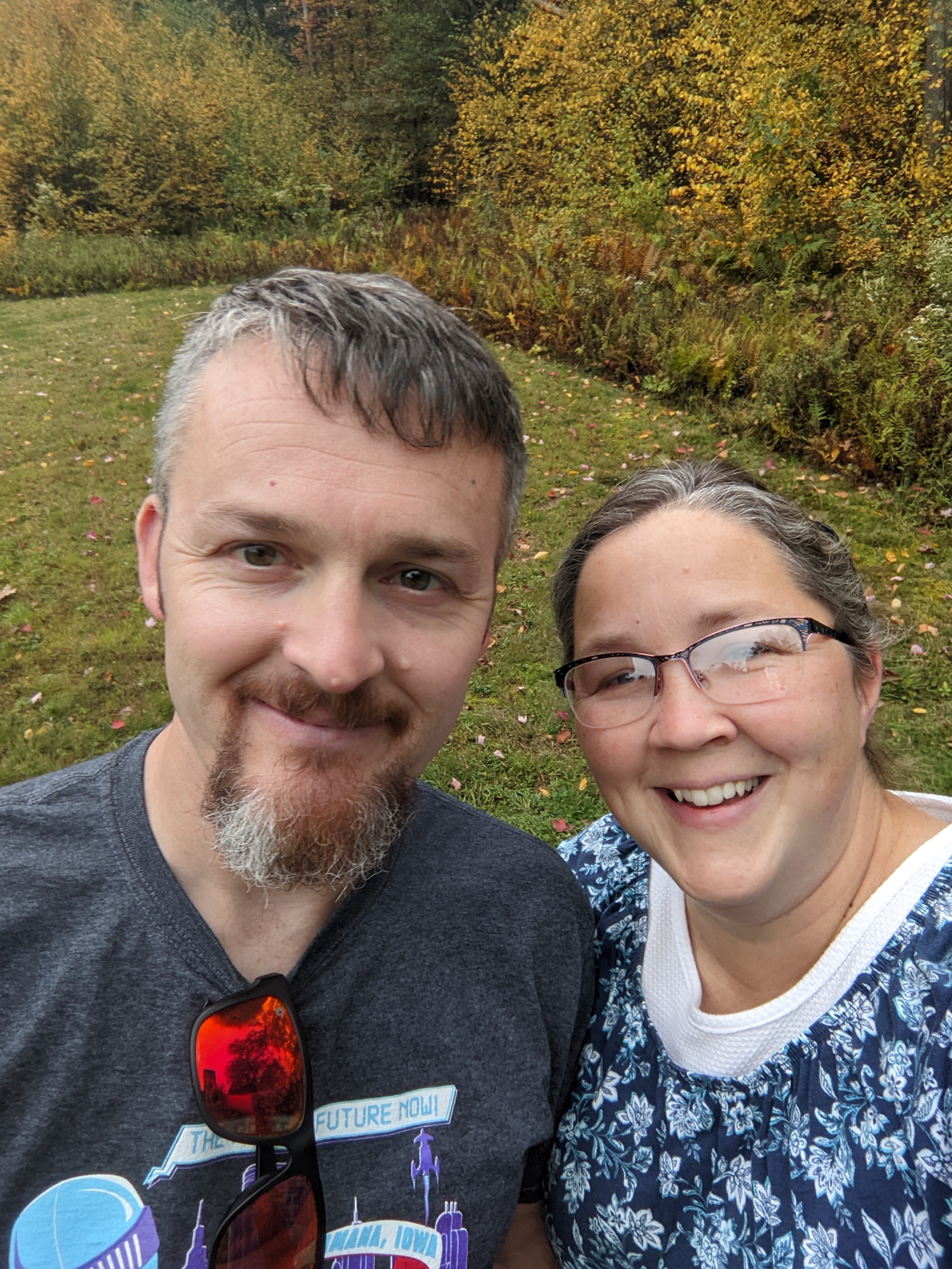 Today started out chilly. I wore a bulky chenille sweater for a few hours, but it got too hot so I switched it for a yellow-green one I bought 13 years ago for our family photo. I still feel affection for this sweater and periodically shave off its pills so that I can keep wearing it. I can’t locate the photo with the whole family, but below is our couple’s photo. Not only did we have five babies, we were babies ourselves, even though we were in our thirties. Someday we will look back at this very time in our lives and talk about how young we look. This idea always fills me with cheer.