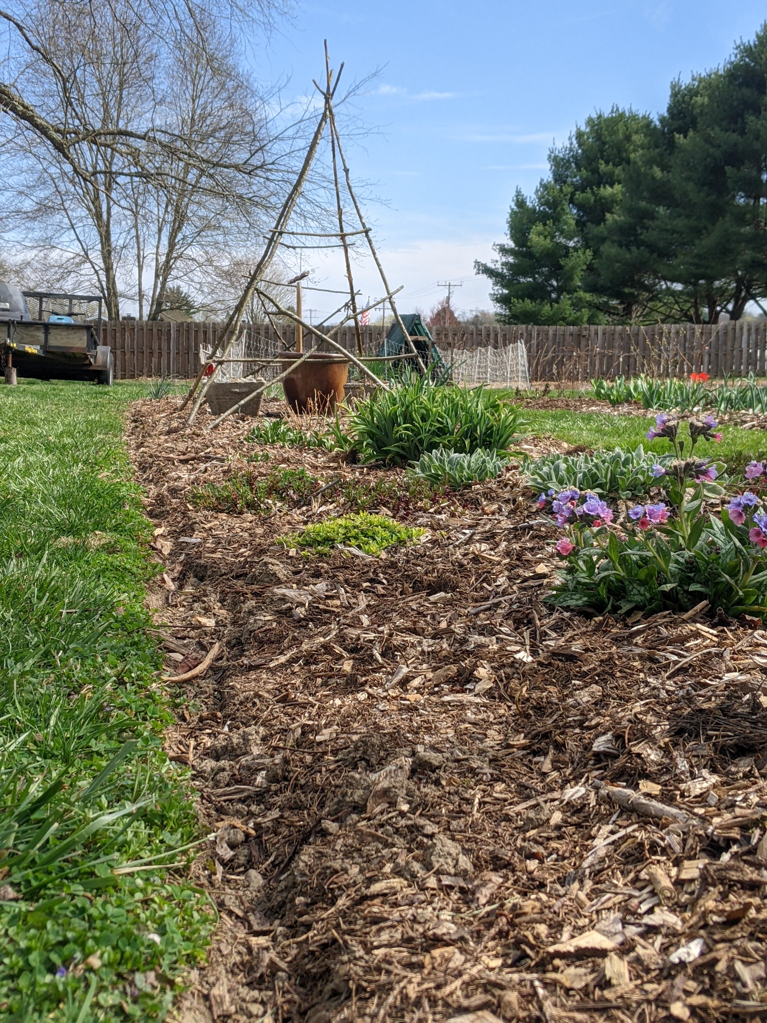 We still have hickory and oak leaves sifting down. I don’t like these tough ones for mulch because they don’t break down much over winter. We resort to blowing them to the edge of the woods. There is a long caterpillar of leaves all along the periphery of the lawn.